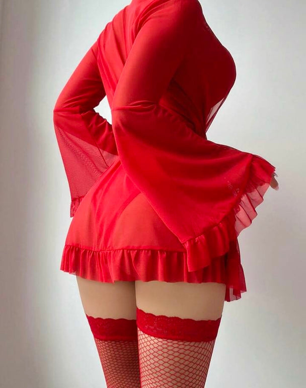 Precio regular ₡ 21.900✨ Body de encaje con abertura en la entrepierna.✨ Bata con cinturón y mangas amplias.✨ Incluye pantimedias.