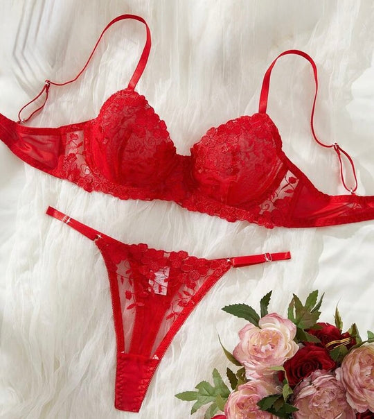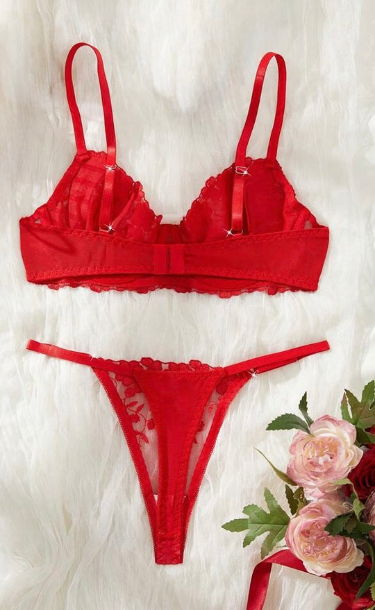Elaborado en delicado encaje color rojo pasión, este set incluye un sostén con aros para realce natural y una tanga a juego que resalta cada curva con elegancia. Perfecto para una noche especial.Precio regular ₡ 15.900
