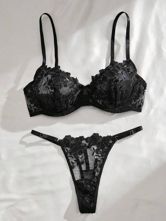 Este conjunto de lencería negra es la perfecta fusión entre elegancia y sensualidad. Confeccionado en tul transparente con bordados florales, el sujetador con aros ofrece realce y soporte, mientras que la tanga de tiras ajustables realza...Precio regular ₡ 15.900 -