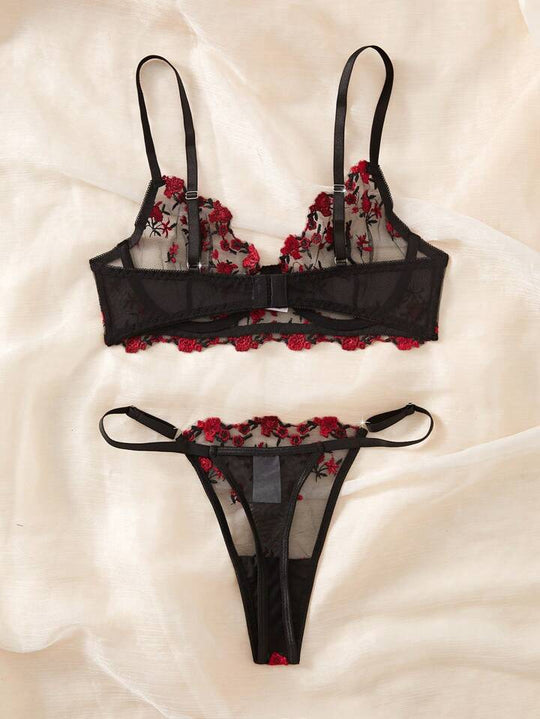 Atrevido, elegante y absolutamente irresistible: así es el conjunto "Rosa Nocturna". El contraste del tul negro con el bordado de rosas rojas crea un efecto visual seductor y de alto impacto. Un must-have para tu colección...Precio regular ₡ 15.900 -