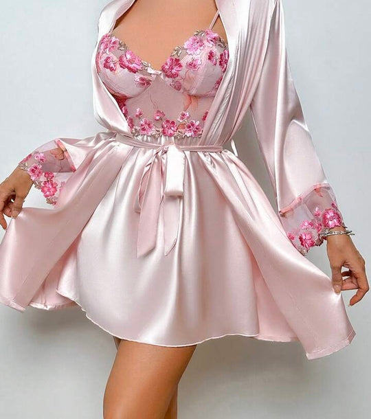 Femenino y delicado, este conjunto rosa satinado con bordados florales en tonos fucsia combina lo romántico con lo sensual. Nuestras batas combinan el arte del diseño con la sensualidad sutil que te acompaña desde el primer...Precio regular ₡ 21.900 -