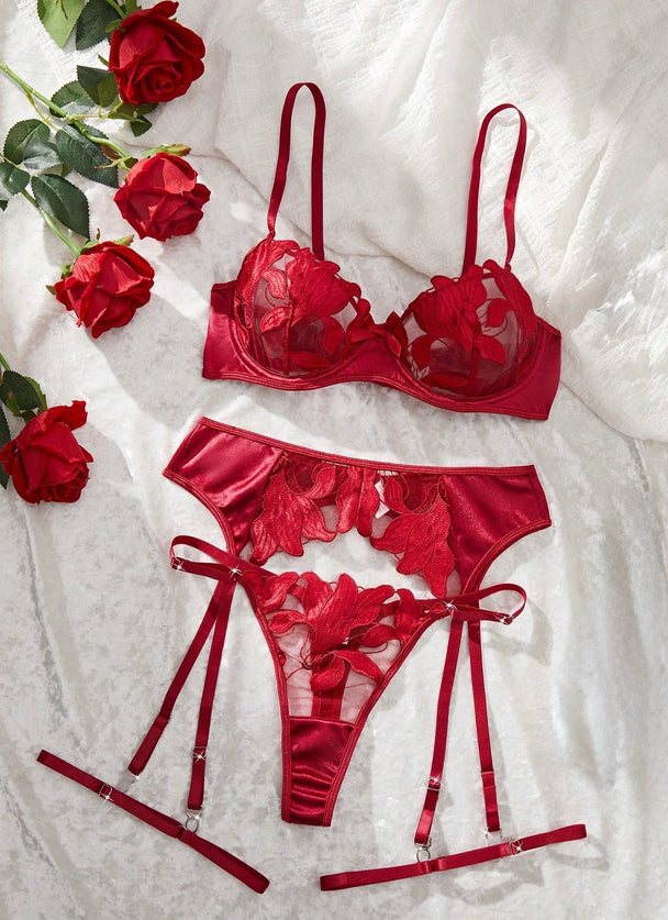 Precio regular ₡ 17.900🌹 Conjunto de tres piezas con bordado de rosas sobre tul nude 👙 Bralette 🎀 Liguero de encaje con volantes y tiras ajustables 💋 Hilo con diseño floral y detalles sensuales -