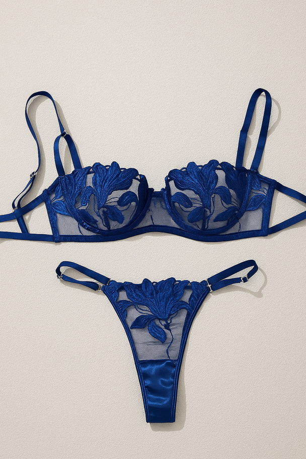 Precio regular ₡ 15.900Seductor y elegante, confeccionado en tul azul transparente y bordado floral, este diseño combina un sostén tipo balconette con su hilo a juego perfecto para una noche mágica. -