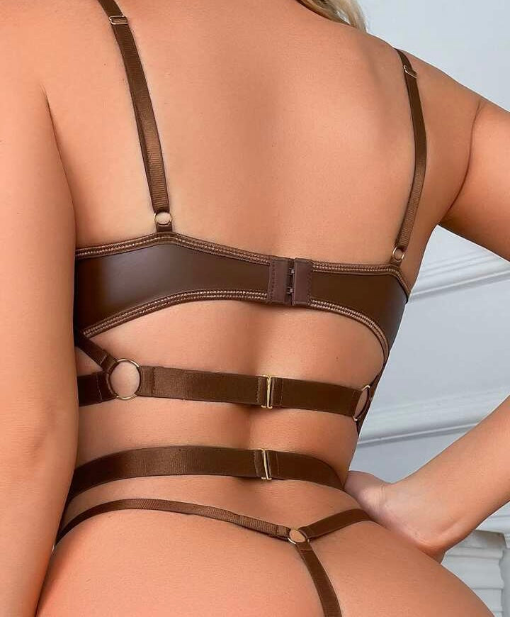 Descubre la esencia de la sensualidad con este exclusivo conjunto de lencería en tono chocolate intenso. Diseñado para realzar la feminidad con un equilibrio perfecto entre elegancia y atrevimiento, combina delicadas tiras ajustables, aros metálicos y cadenas doradas que acarician la silueta con sofisticación. Una pieza única para quienes desean seducir con estilo.