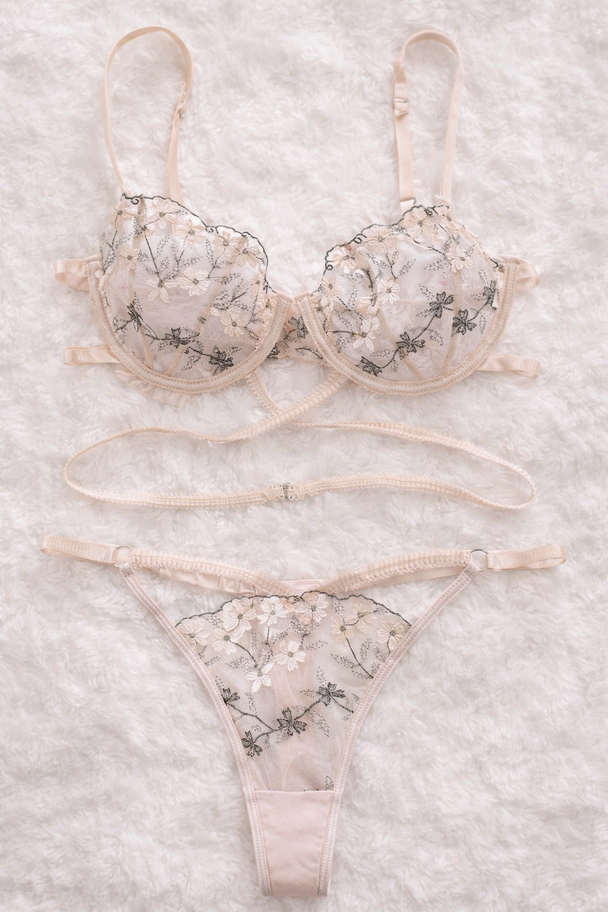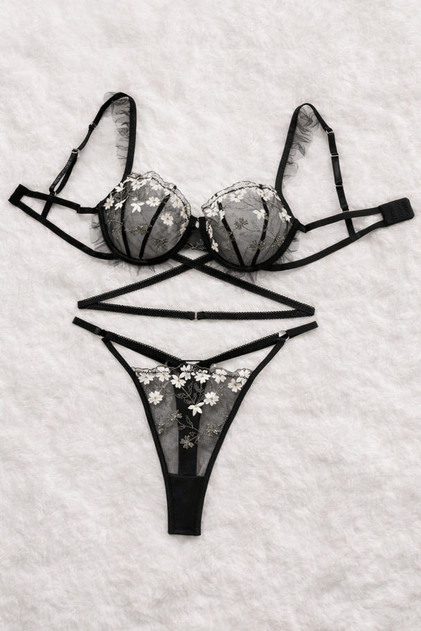 Precio regular ₡ 17.900✨ Sujetador con aros. ✨ Liguero estilo arnés con detalles florales en cascada. ✨ Hilo translúcido de corte alto que estiliza la figura. -