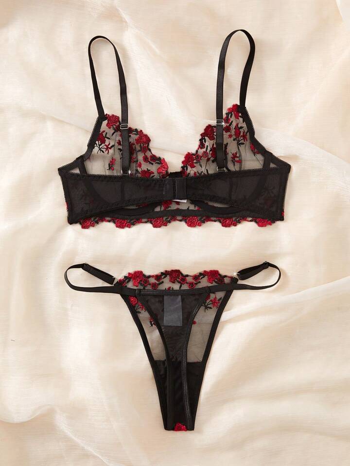 Atrevido, elegante y absolutamente irresistible: así es el conjunto "Rosa Nocturna". El contraste del tul negro con el bordado de rosas rojas crea un efecto visual seductor y de alto impacto. Un must-have para tu colección de lencería sensual.